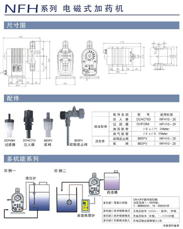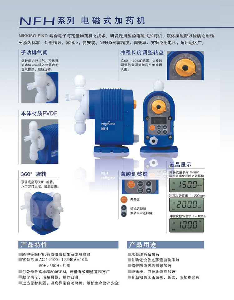 • 產品描述:NIKKISO EIKO日機裝NFH20系列結合電子與定量加藥機之技術,研發泛用型的電磁式加藥機,液體接觸部以優質之耐蝕材質為標準,外型精致,體積小,易安裝。NFH系列高精度、高效率、寬頻泛用電壓,適用地區廣。